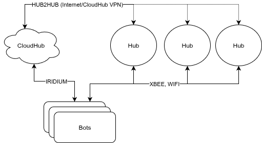 The figure below diagrams the flow for messages between the bots and hubs using this intermediate server, as well as Iridium's servers.