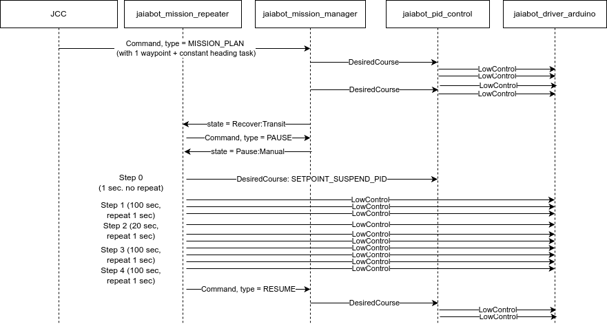 jaiabot_mission_repeater to stop the PID then run a set of constant motor/rudder commands (using jaiabot/config/templates/bot/jaiabot_mission_repeater.pb.cfg.in).Sequence diagram for this mission: